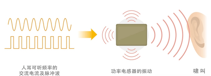 當流過人耳可聽范圍頻率的電流時,功率電感器主體發生的振動會引起嘯叫。其振動原因以及噪音原因有以下幾種可能。