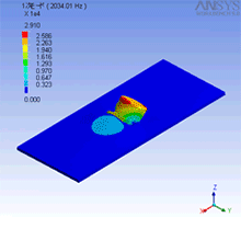 一般情況下,結構體發生共振的固有值(固有振動數)擁有多個,與此相應,會有各種各樣的振動模式。在該"功率電感器+基板"的分析模型中,隨著頻率的提高,各固有振動數也會出現各種各樣的振動模式。