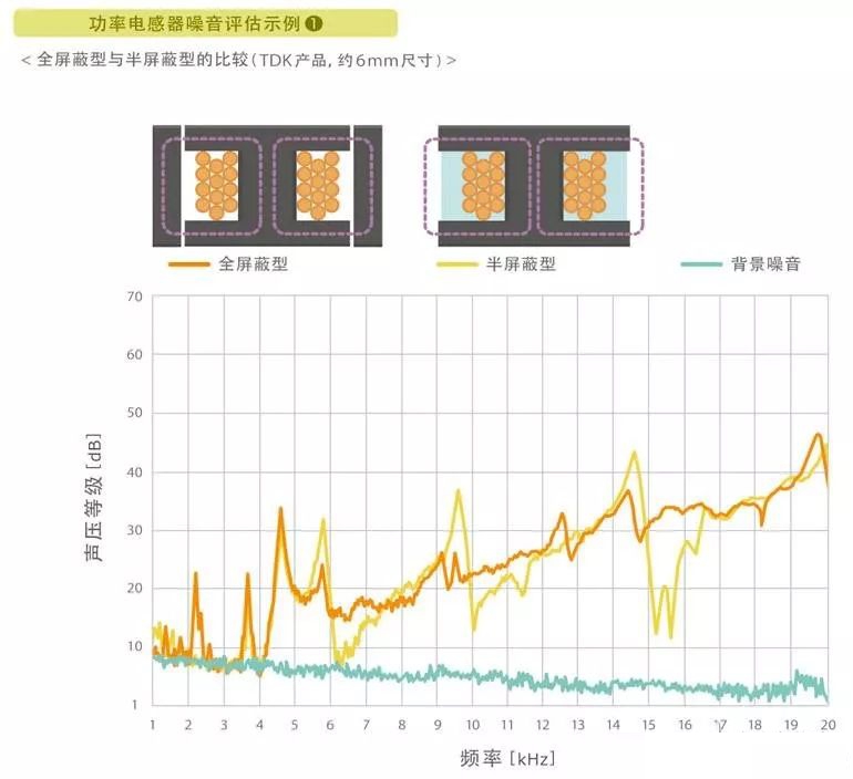 比較全屏蔽型與金屬一體成型型產品時,其中的差異較為顯著。全屏蔽型中,在大范圍的頻帶內產生有30~50dB左右水平的噪音。而在金屬一體成型型中,在大范圍頻帶內,其與背景噪音處于同等低的水平,即使在峰值部位,其與全屏蔽型相比也抑制了大約20dB。抑制20dB也就意味著僅為10分之1的水平,由此可見,置換為金屬一體成型型是有效的對策。