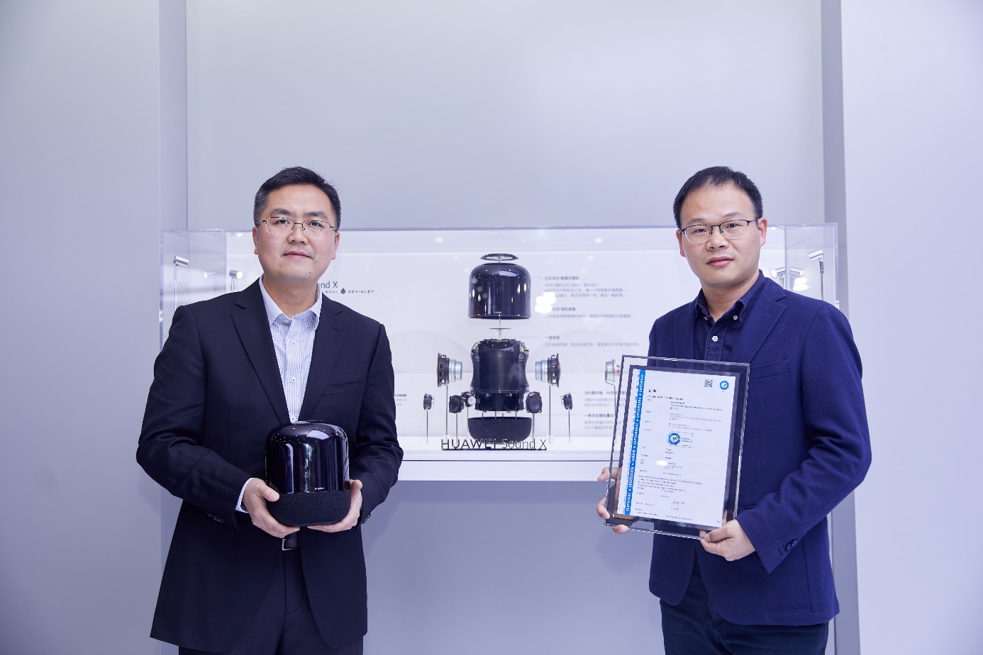 TUV南德電子電氣研發部經理唐杰(左)為華為終端智能音箱產品總經理何瑞峰(右)頒發證書