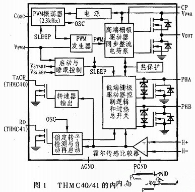 THMC40/41驅動器內部由23kHz PWM振蕩器、PWM產生器、轉速器、高端柵極驅動器、低端柵極驅動器、霍爾傳感比較器、啟動和睡眠檢測電路、鎖定轉子檢測與自動再啟動電路、熱管理電路、高低端開關、同步開關電路以及電源電路等部分構成,圖1所示其內部結構框圖。