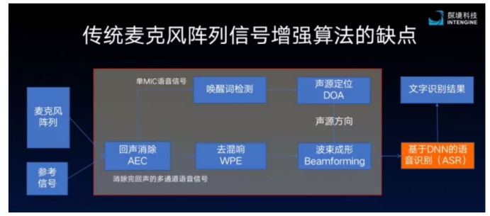 再者,傳統(tǒng)的流程對硬件要求非常高,對MIC的一致性以及電容元器件的一致性要求非常高。這就節(jié)能會導(dǎo)致大家在實驗室和在量產(chǎn)線上取得不同的結(jié)果。量產(chǎn)場景下的識別率非常差。這主要與波束成形和聲源定位要求高,一旦出現(xiàn)波動會影響識別效果有關(guān)。