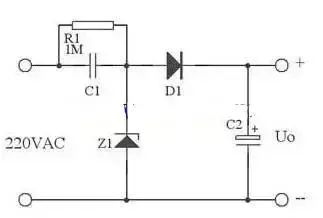 在實際應用中,可以用下圖代替上圖,這里用了Z1正向特性和反向特性,其反向特性(也就是其穩壓特性)來穩定電壓,其正向特性用來在市電負半周給C1提供放電回路。