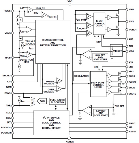 The ADP5360 combines one high performance linear charger for a single lithium-ion (Li-Ion)/lithium-polymer (Li-Poly) battery with a programmable, ultralow quiescent current fuel gauge and battery protection circuit, one ultralow quiescent buck, one buck boost switching regulator, and a supervisory circuit that can monitor output voltage.
