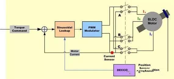 轉軸轉矩= 1.5I0*Kt(一個獨立于轉軸角度的常數)正弦整流換向無刷電機控制器努力驅動三個電機繞組,其三路電流隨著電機轉動而平穩的進行正弦變化。選擇這些電流的相關相位,這樣它們將會產生平穩的轉子電流空間矢量,方向是與轉子正交的方向,并具有不變量。這就消除了與北形轉向相關的轉矩紋波和轉向脈沖。