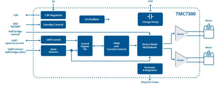 Trinamic的TMC7300是公司的第二個(gè)用于低壓應(yīng)用的IC。 具有基于UART的扭矩和速度控制功能的電源驅(qū)動(dòng)器,可以用2(1.8)…11V直流電驅(qū)動(dòng)最多兩個(gè)直流電機(jī)。