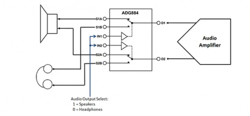 圖 2:該基本電路使用單個 Analog Devices ADG884 在兩個音頻輸出設備之間切換