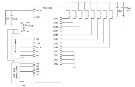 NCV7240包含八個(gè)獨(dú)立的熱傳感器,位于每個(gè)輸出驅(qū)動(dòng)器附近。當(dāng)檢測(cè)器檢測(cè)到過(guò)熱事件(通常為175℃)時(shí),通道將被鎖存。在該通道被鎖存的時(shí)候還可以操作未受影響的通道。