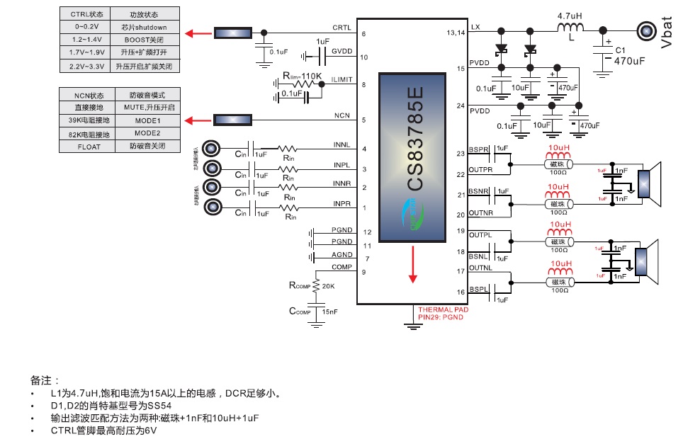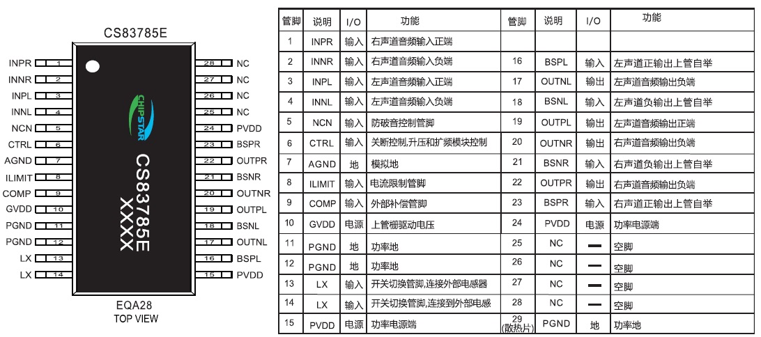 CS83785E是一款兼顧12V適配器供電應(yīng)用針對單節(jié)鋰電應(yīng)用 ,帶兩種防破音模式 ,擴(kuò)頻模塊 ,內(nèi)置BOOST升壓模塊,R類立體聲音頻功率放大器?梢詾4Ω 的負(fù)載提供最高 2X10W的恒定功率.CS83785E管腳完全兼容CS83711E,為音頻子系統(tǒng)的功放設(shè)計以及終端產(chǎn)品的升級更換提供了可觀的功率裕量以及最大的便利性。CS83785E的全差分架構(gòu) 和極高的PSRR有效地提高了CS83785E對RF噪聲的抑制能力。無需濾波器的PWM調(diào)制結(jié)構(gòu)及內(nèi)置的BOOST升壓模塊,以及CS83785E采用專有的AERC((Adaptive Edge Rate Control)技術(shù) ,在音頻全帶寬范圍內(nèi)極大地降低了EMI的干擾,對60cm的音頻線,在FCC的標(biāo)準(zhǔn)下具有超過20dB的裕量,另外CS83785E內(nèi)置了過流保護(hù),短路保護(hù)和過熱保 護(hù),有效的保護(hù)芯片在異常的工作條件下不被損壞。