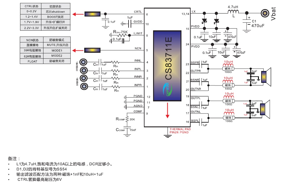 CS83711E的全差分架構(gòu)和極高的PSRR有效地提高了CS83711E對(duì)RF噪聲的抑制能力。無需濾波器的PWM調(diào)制結(jié)構(gòu)及內(nèi)置的BOOST升壓模塊,以及CS83711E采用專有的AERC(Adaptive Edge Rate Control)技術(shù) ,在音頻全帶寬范圍內(nèi)極大地降低了EMI的干擾,對(duì)60cm的音頻線,在FCC的標(biāo)準(zhǔn)下具有超過20dB的裕量,另外CS83711E內(nèi)置了過流保 護(hù),短路保護(hù)和過熱保護(hù),有效的保護(hù)芯片在異常的工作條件下不被損壞。