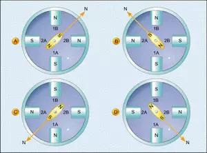 現(xiàn)在假設(shè)我們構(gòu)造一個定子上纏繞有兩個繞組的電機,內(nèi)置一個能夠繞中心任意轉(zhuǎn)動的永久磁鐵,這個可旋轉(zhuǎn)部分叫做轉(zhuǎn)子。圖2給出了一種簡單的電機,叫做雙相雙極電機,因為其定子上有兩個繞組,而且其轉(zhuǎn)子有兩個磁極。如果我們按圖2a所示方向給繞組1輸送電流,而繞組2中沒有電流流過,那么電機轉(zhuǎn)子的南極就會自然地按圖中所示,指向定子磁場的北極。