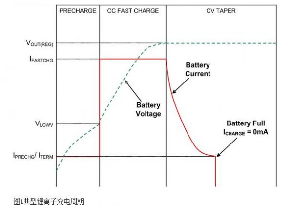 鋰離子電池要求專門的充電周期,以完成安全充電并最大化電池運用時間。電池充電分兩個階段:安穩電流 (CC) 和安穩電壓 (CV)。電池位于徹底充溢電壓以下時,電流經過穩壓進入電池。在CC辦法下,電流經過穩壓達到兩個值之一。假定電池電壓非常低,則充電電流下降至預充電電平,以習慣電池并避免電池損壞。該閾值因電池化學特點而不同,一般取決于電池制造廠商。一旦電池電壓升至預充電閾值以上,充電便升至快速充電電流電平。典型電池的最大建議快速充電電流為1C(C=1 小時內耗盡電池所需的電流),但該電流也取決地電池制造廠商。典型充電電流為~0.8C,目的是最大化電池運用時間。對電池充電時,電壓上升。一旦電池電壓升至穩壓電壓(一般為4.2V),充電電流逐步減少,一同對電池電壓進行穩壓以避免過充電。在這種辦法下,電池充電時電流逐步減少,一同電池阻抗下降。假定電流降至預訂電平(一般為快速充電電流的10%),則終止充電。咱們一般不對電池浮充電,因為這樣會縮短電池運用壽數。圖1 以圖形辦法闡清楚典型的充電周期。