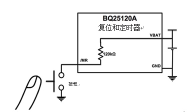 BQ25120A系列產品充電器的運輸節電模式使用按鈕接口實現,如圖2所示。按鈕輸入(/MR)在內部上拉至VBAT管腳。當器件處于運輸節電模式且用戶按下/MR按鈕時,產品將退出運輸節電模式。