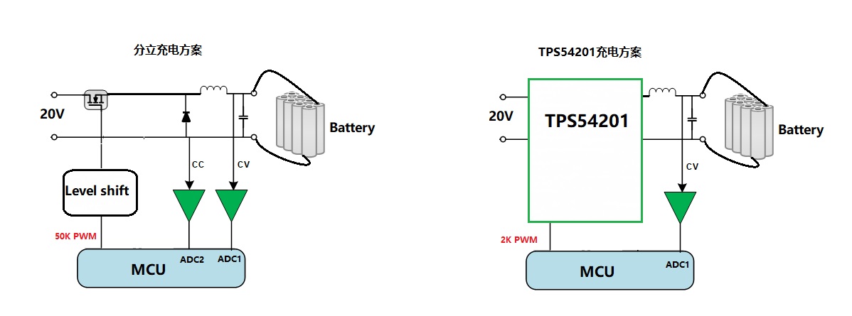 圖1 分立方案VS TPS54201-鋰電池充電管理