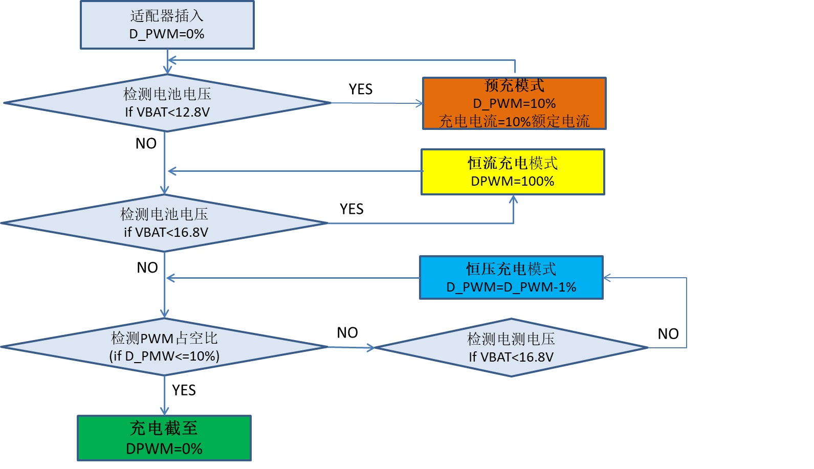 為了更好的保護鋰電池,一般要求充電過程按涓流充電(低壓預充)、恒流充電、恒壓充電以及充電截至四個階段。圖3是TPS54201的充電管理流程圖,以四節鋰電池為例,當適配器插入后,初始的PWM占空比D_PWM=0,當MCU 檢測到電池電壓小于12.8V, 設定D_PWM=10%, 進入預充階段,此時的充電電流是額定電流的10%。當電池電壓上升并達到12.8V后,設定D_PWM=100%,進入恒流充電階段,充電電流上升至額定電流。隨著充電電壓上升并達到額定電壓16.8V時,進入恒壓充電階段,以1%為步長(step),逐步減少D_PWM,保持電池電壓接近額定電壓16.8V。最后D_PWM減少至10%時,充電電流等于截至電流(通常為10%的額定充電電流),設定D_PWM=0%, 充電截至。