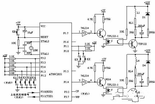 AT89C2051將控制脈沖從P1口的P1.4~P1.7輸出,經74LS14反相后進入9014,經9014放大后控制光電開關,光電隔離后,由功率管TIP122將脈沖信號進行電壓和電流放大,驅動步進電機的各相繞組。使步進電機隨著不同的脈沖信號分別作正轉、反轉、加速、減速和停止等動作。圖中L1為步進電機的一相繞組。AT89C2051選用頻率22MHz的晶振,選用較高晶振的目的是為了在方式2下盡量減小AT89C2051對上位機脈沖信號周期的影響。