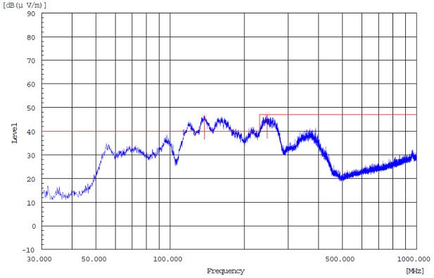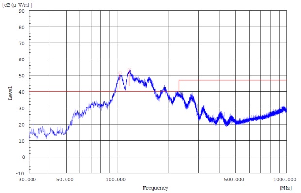 HT360使用Demo板12V供電、輸出接2個4ohm喇叭,喇叭線長度約10cm, 輸出接了330R@100MHz磁珠和下地的1nF電容,使用1kHz信號輸出2*15W時,測得的輻射曲線如下圖(取輻射嚴重的方向)。