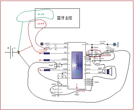 電路板上所有的器件以及單元電路都是以地線作為參考電位。原理上地線作為零電位,器件之間不會產生由于地線的耦合干擾。但實際是不可能的,所有引線都具有阻抗,只要地線有電流流過,就會產生相應的壓降。電路走線還會形成電感,這意味著電流從電源正極流向負載,然后返回電源負極,在整個電流通道上存在一定的電感。工作在較高頻率時,電感將增大地線阻抗,比如DC-DC升壓電路中電源-電感-MOS管-地通路。如果不分地,特別整個地平面不完整,音頻功放信號又是單端輸入的情況下,數字電路以及升壓電路的開關噪聲就會通過地線耦合到音頻功放的輸入端或者電源端,最終喇叭輸出明顯的底噪聲。所以分地是一個處理底噪聲的好辦法。以內置升壓音頻功放CS8330用于藍牙音箱為例,可將整個PCB板地線分成三部分:DGND, PGND, AGND。DGND是主控數字電路部分,包括藍牙射頻部分地線可跟數字地接一起。PGND主要是音頻功放DC-DC升壓部分以及功率放大部分,包括外圍的濾波電容。充電部分可在功放的前端接一起,也可單獨一部分。AGND包括藍牙主控芯片ADC, DAC,MIC部分模擬地以及音頻功放內部輸入端預放部分模擬地。最終DGND,PGND,AGND三大塊在電池或者電源輸入端匯總一點接地。如下圖所示:
