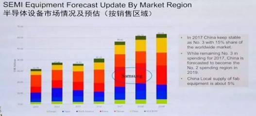 據相關數據顯示,中國大陸本土廠商的半導體設備,只占全球市場份額的1~2%。而從下圖,我們可以看到,中國大陸市場對半導體設備的需求量巨大,而且還在快速增長當中。