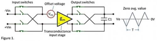 跨導放大級的失調電壓存在于輸入開關網絡,它被輸出開關反向并周期性地傳送到輸出端。失調電壓引起的輸出電流會導致電容 C1 兩端產生電壓,這個電壓會隨著換向開關的換向而以相同斜率上升和下降。運放內部邏輯通過平衡上升和下降時間來保證電容 C1 輸出電壓為零,從而實現零失調。
