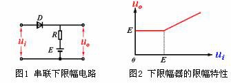 圖1所示的限幅電路中,因二極管是串在輸入、輸出之間,故稱它為串聯限幅電路。圖中,若二極管具有理想的開關特性,那么,當ui低于E時,D不導通,uO=E;當ui高于E以后,D導通,uO=ui。該限幅器的限幅特性如圖2所示,當輸入振幅大于E的正弦波時,輸出電壓波形見圖3。可見,該電路將輸出信號的下限電平限定在某一固定值E上,所以稱這種限幅器為下限幅器。如將圖中二極管極性對調,則得到將輸出信號上限電平限定在某一數值上的上限幅器。