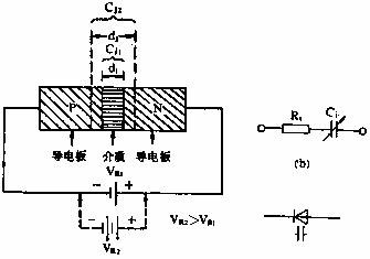 變?nèi)荻䴓O管的簡化等效電路及電路符號分別如圖1(b)、(c)所示。圖中用一只可變電容來表示結(jié)電容。R2是半導體材料的電阻。