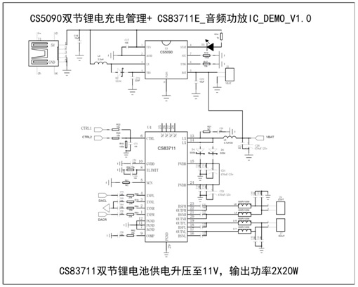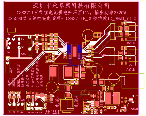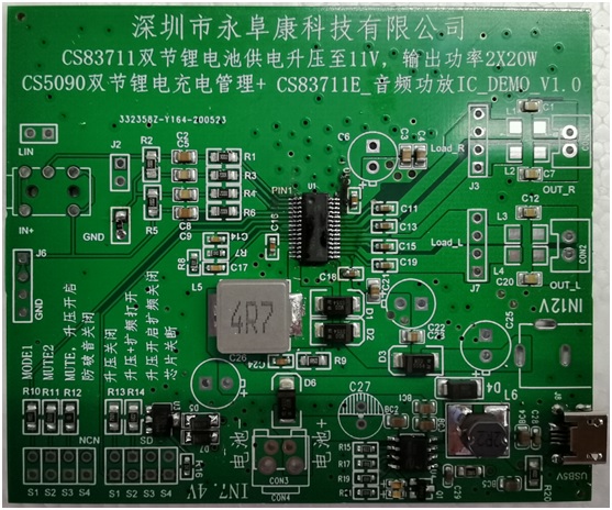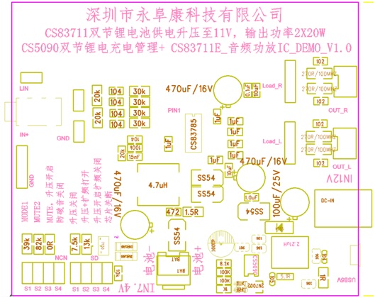 - 采用CS83711功放IC,該芯片6V-9V供電內置升壓11V提供2*16W/4歐功率輸出;