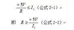 該排阻公共端接電源,即上拉電阻形式,作用是增強FPGA芯片I/O口(以下簡稱I/O口)的驅(qū)動能力,實際上就是增加I/O輸出高電平時輸出電流的大小。當I/O輸出高電平時,+5V電源經(jīng)排阻與IN1~4相連,相當于為I/O提供一個額外的電流輸出源,從而提高驅(qū)動能力。當I/O輸出低電平時,可將I/O近似看做接地,而IN1~4因與I/O由導(dǎo)線直接相連,因此直接接受了I/O的低電平輸出信號。此時,+5V電源經(jīng)排阻R、I/O內(nèi)部電路(電阻近似為零)后接地,因此該路的電流不能大于I/O的拉電流(Ii)最大值,有公式2-1:
