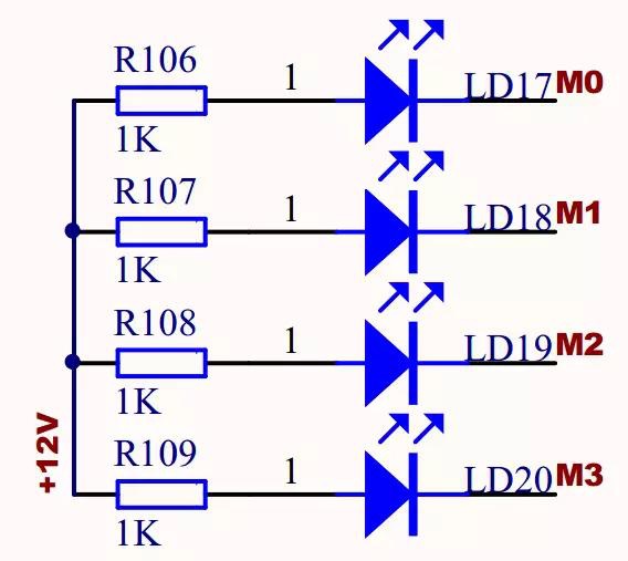 電機部分指示燈用于指示各路信號的邏輯電平狀態(tài),其中R106~109為限流電阻,防止發(fā)光二極管因電流過大燒毀。值得注意的是:該指示燈的發(fā)光二極管接成共陽極,由M0~3信號端口產(chǎn)生低電平點亮對應(yīng)的二極管,而ULN2003的OUT與IN邏輯電平相反,因此對于I/O口FM0~3來說,輸出高電平就能點亮對應(yīng)的發(fā)光二極管,例如:FM0輸出高電平,則對應(yīng)LD17點亮,編程時應(yīng)注意此電路將I/O實際邏輯反相了兩次,對應(yīng)關(guān)系為I/O口輸出哪路高電平則對應(yīng)點亮哪路指示燈。
