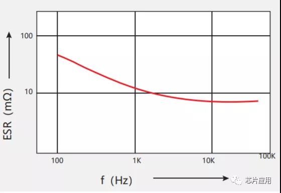 紋波電流的頻率修正系數 , 將影響壽命的各頻率下的紋波電流應力設定為同等 , 是非常具有意義的數值。紋波動電流引起的發熱產生影響的電阻值(等效串聯電阻 ,ESR), 如下圖所示 , 呈現一旦頻率升高就會下降的傾向。因此 , 頻率越高 , 紋波電流就越易于流過。