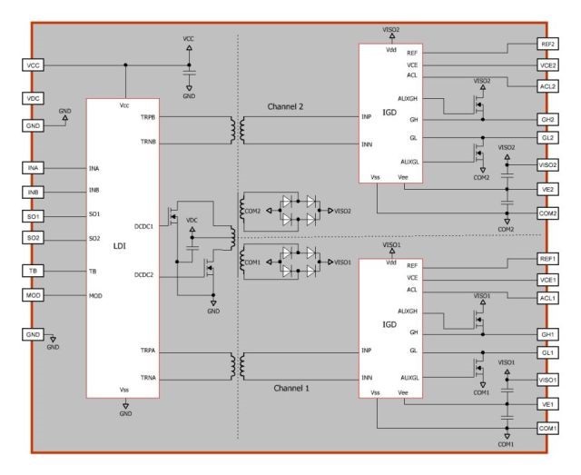 該公司的SID11x2K系列以標(biāo)準(zhǔn)eSOP封裝的單通道IGBT和MOSFET驅(qū)動(dòng)器為代表。該系列采用固體絕緣體FluxLink技術(shù)提供增強(qiáng)型電氣隔離。其8 A峰值輸出電流能夠驅(qū)動(dòng)高達(dá)600 A(典型值)的設(shè)備,而無需任何其他有源組件。