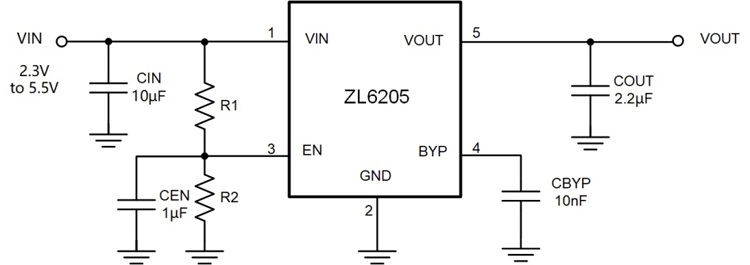 對于上下電需要一步到位的供電系統,可以使用下圖6這樣的電路。因為ZL6205帶使能引腳,有著相對穩定的使能電壓閾值。通過不同比例的分壓電阻可以設置芯片上電啟動電壓值和掉電輸出關閉電壓。