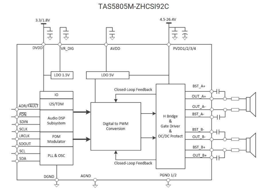 50W立體聲/100W單聲道、數(shù)字輸入音頻功放芯片,內(nèi)置DSP多種音頻處理效果 |