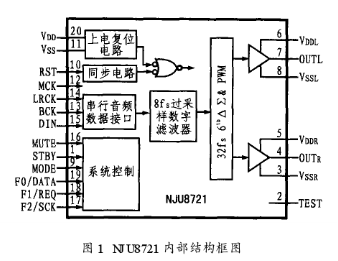 NJU8721芯片內含上電復位電路、同步電路、串行音頻數據接口、控制電路、8f。過采樣數字濾波器、6階32fsΔ-∑與PWM電路以及左/右聲道輸出級等電路,圖1所示是其內部結構框圖。