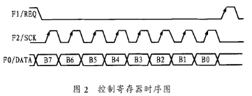 當控制模式選擇在串行控制時,可用控制寄存器設定各種模式。控制數據將從F2/SCK的上升沿引入,同時在Fl/REQ的上升沿被置位并進入控制寄存器。在F1/REQ上升脈沖到來之前,最后8位數據有效。圖2為控制寄存器的時序圖。
