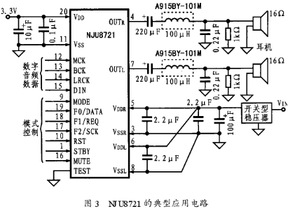 NJU8721的典型應用電路如圖3所示。其中3.3V電源電壓加至IC的20腳,開關電壓調節器輸出的3.3~5.25V的穩定電壓分別加到IC的5腳和6腳,從而為輸出驅動器電路提供DC偏置。數字音頻數據從12腳-15腳輸入后,即可通過IC的1腳、9腳、10腳和16-19腳輸入模式控制信號。在IC的4腳和7腳上的PWM信號分別經LC濾波器轉換后可產生模擬音頻信號以驅動兩個聲道上的16Ω耳機。