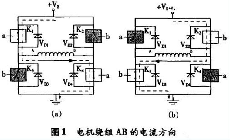 4個開關(guān)K1和K4,K2和K3分別受控制信號a,b的控制,當控制信號使開關(guān)K1,K4合上,K2,K3斷開時,電流在線圈中的流向如圖1(a),當控制信號使開關(guān)K2,K3合上,K1,K4斷開時,電流在線圈中的流向如圖1(b)所示。4個二極管VD1,VD2,VD3,VD4為續(xù)流二極管,它們所起的作用是:以圖1(a)為例,當K1,K4開關(guān)受控制由閉合轉(zhuǎn)向斷開時,由于此時線圈繞組AB上的電流不能突變,仍需按原電流方向流動(即A→B),此時由VD3,VD2來提供回路。因此,電流在K1,K4關(guān)斷的瞬間由地→VD3→線圈繞組AB→VD2→電源+Vs形成續(xù)流回路。同理,在圖1(b)中,當開關(guān)K2,K3關(guān)斷的瞬間,由二極管VD4,VD1提供線圈繞組的續(xù)流,電流回路為地→VD4→線圈繞組BA→VD1→電源+Vs。步進電機驅(qū)動器中,實現(xiàn)上述開關(guān)功能的元件在實際電路中常采用功率MOSFET管。