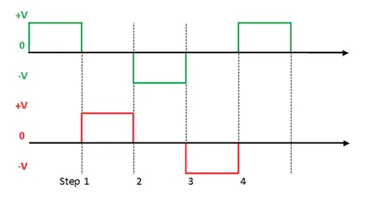 圖 2:雙極步進電機上的兩個線圈必須根據上圖進行分別驅動,才能使電機在每次波形變化時運動一整步。首先在一個方向上驅動每個線圈中的電流;接下來線圈空閑;然后以相反方向驅動電流。(圖片來源:Digi-Key)