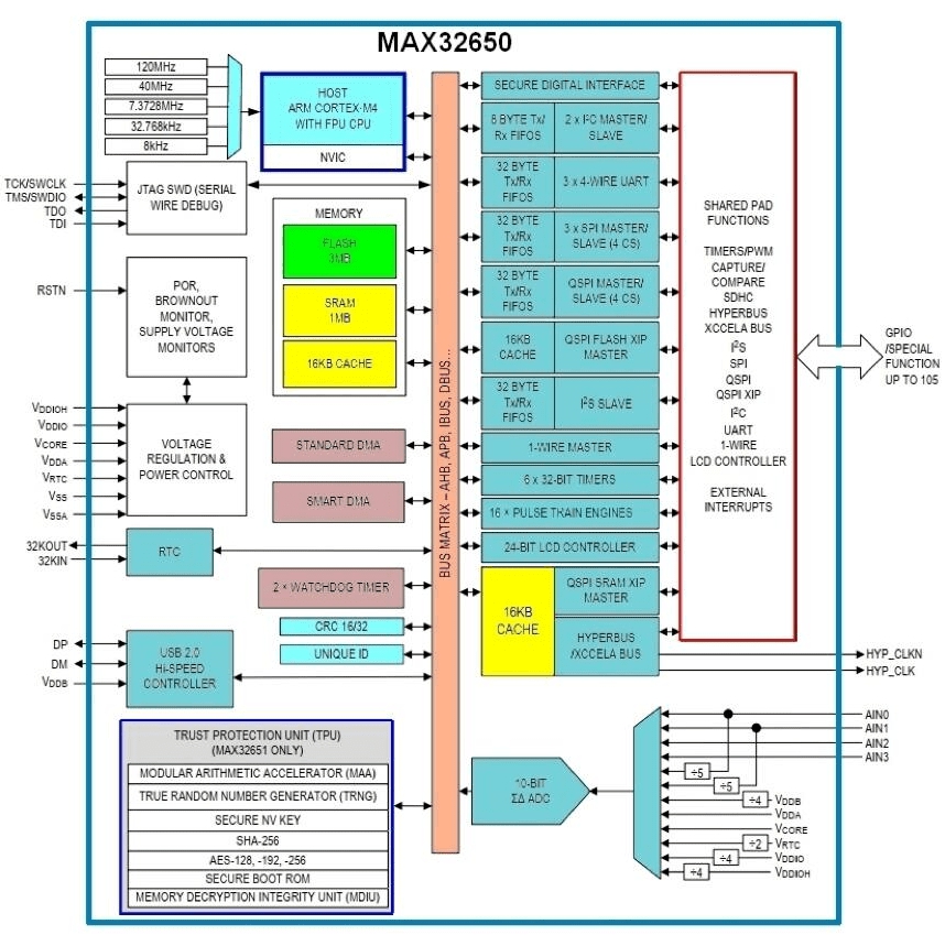 Maxim Integrated 利用以 120 兆赫茲 (MHz) 頻率運行的 MAX32650 Arm Cortex®-M4F 微控制器解決了這一問題。它具有廣泛的外設,包括三個標準 SPI 接口、一個四通道 SPI、三個 UART、兩個 I2C 端口、一個帶物理層 (PHY) 的 USB 2.0 高速接口、六個 32 位定時器,以及一個 AES-256 加密單元(圖 3)。