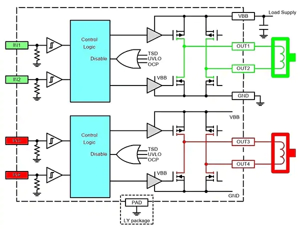 圖 4:Allegro MicroSystems 的 A3909 是雙 H 橋驅動器,可為步進電機線圈提供高達 1 A 的拉出和灌入電流。
