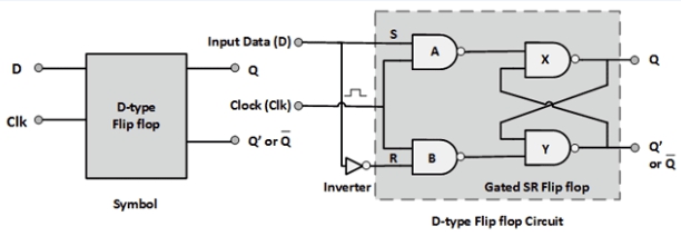 所以D觸發器基本就是S-R觸發器的改進版。在S-R出發其中,S=0和R=0的情況是不允許的,因為這會讓觸發器的行為充滿不確定性。該問題在D觸發器中解決了,通過在兩個輸入之間加入一個逆變器(見上方原理圖)。而第二輸入則給到去NAND門的時鐘脈沖。此處的逆變器是為了避免輸入上的相同邏輯電平,這樣"S=0同時R=0"的情況就不會發生了。