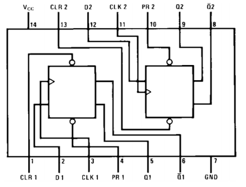這里的7474我們使用的是仙童的DM74S74N,這是一個雙D觸發器,其中內含兩個D觸發器,既可以單獨使用也可以實現主從組合。這個電路中我們只需使用其中的一個D觸發器。第一個觸發器的引腳在左邊,第二個觸發器的引腳在右邊。其中還有PRE和CLR引腳,這些是D觸發器的低電平有效引腳。它們可以分別用來設置或重置D觸發器,而不用考慮輸入D和時鐘。我們將其與Vcc相連好讓它們處于閑置狀態。