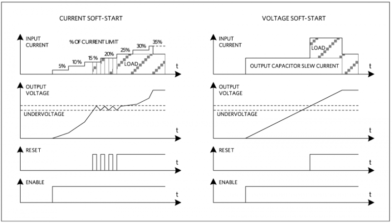 種方法是電流軟啟動。大多數穩壓器具有電流限值;電流軟啟動是緩升或步進到該電流限值。由于輸出電容充電量遠遠小于 負載電流,軟啟動使得輸出電壓緩慢上升。電流軟啟動的優點是穩壓器輸入電流穩定上升,不會將負載啟動的瞬態電流傳遞到輸入。