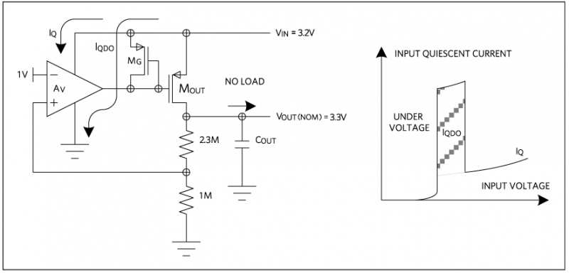假設隨著電池電量的消耗,使得輸入與輸出之間的壓差達到很小的狀態。此時的線性穩壓器,即使負載電流非常小,也會強制 FET 導通, 地減小輸入與輸出之間的壓降。工作在 壓差時的潛在問題是,驅動穩壓器輸出 FET 的柵極驅動電路將消耗較大電流(圖 2)。使得“待機模式”變為“電池快速放電模式”。