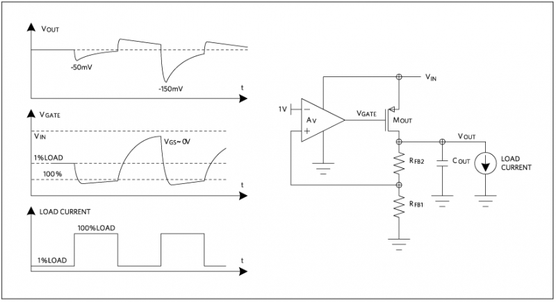 保證穩壓器輸出負載 在一定程度上可以規避大的負載瞬變,但這不是有效的解決方案。當穩壓器從滿載躍變到輕載時,往往會發生輸出過沖。而穩壓器從過沖狀態恢復的過程中,器件處于比較敏感狀態 —— 此時的輸出 FET 完全沒有偏置。這種狀態下,如果出現另 負載階躍,輸出則出現下沖,比 次更為嚴重。