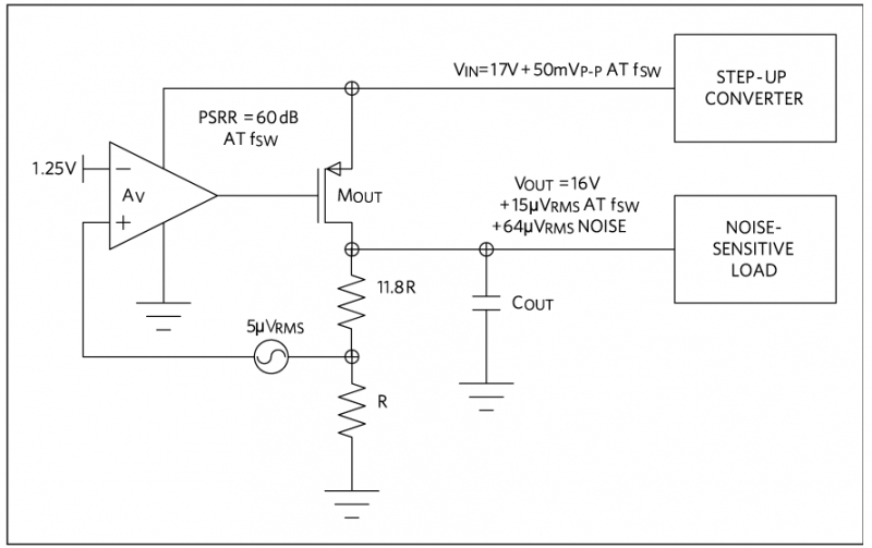 對于較高的輸出電壓,線性穩壓器的輸出噪聲可能成為 PSRR 的決定因素。這是因為分壓后的反饋輸入噪聲增大了。假如一個線性穩壓器將噪聲較高的升壓轉換器的 17V 輸出轉換為噪聲較小的 16V 電源,紋波小于 100uV。開關頻率處的 PSRR 為 60dB,50mVP-P 升壓轉換器紋波將衰減到 50uVP-P,或者輸出噪聲 15uVRMS。如果采用 5uVRMS 低噪聲基準和反饋運放輸入,我們來看一下反饋輸入產生的問題。如果反饋輸入調整在 1.25V,電阻反饋網絡將輸出設置為 16V,那么輸出噪聲將增大到 5uVRMS x (16V/1.25V),即 64uVRMS,這可能成為主要的噪聲源。(圖 5)顯示了高壓輸出造成的輸出噪聲性能下降。