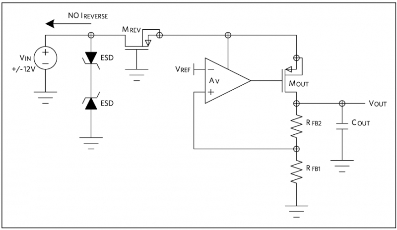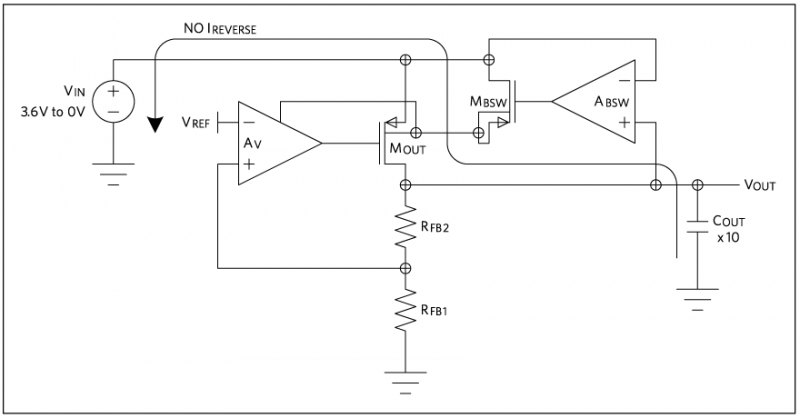 線性穩壓器的輸出調整管大多包含體二極管,該二極管可防止輸出比輸入高出 0.7V 以上。大多數情況下,該二極管不是問題,但在兩種情況下會引起麻煩。