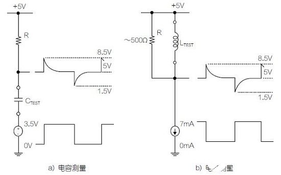 關于該電路的運行,首先請看圖1中所示的基本原理圖。在圖1a中,方波電壓源驅動被測電容器的底部端子。頂部端子電壓為一系列在+5V電源軌上下呈指數衰減的正向和負向脈沖。衰減時間常數自然為R和CTEST的乘積。同樣地,在圖1b中,方波電壓源饋入被測電感器,從而在+5V電源軌上下引起類似的瞬變,此時衰減時間常數則等于LTEST/R。在電壓呈指數衰減的過程中,被占用方波的兩個半周各自的比例由時間常數和振蕩周期之間的關系決定。