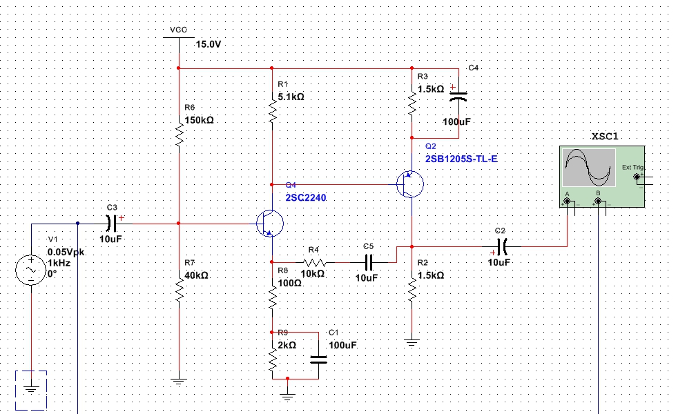 假設Tr1的發射級電流1mA,則可以求得發射級電阻的值,在設計過程中,為了滿足使用條件,應該盡量增加第一級電路的放大倍數來提高開環增益,但是增加增益的條件是增加及集電極電阻Rc的值,但Rc的值太大,使得Tr2的集電極的電位過于接近GND,導致不能輸出最大的電壓。這里取集電極的壓降為5V,理論上可以輸出10Vp-p。