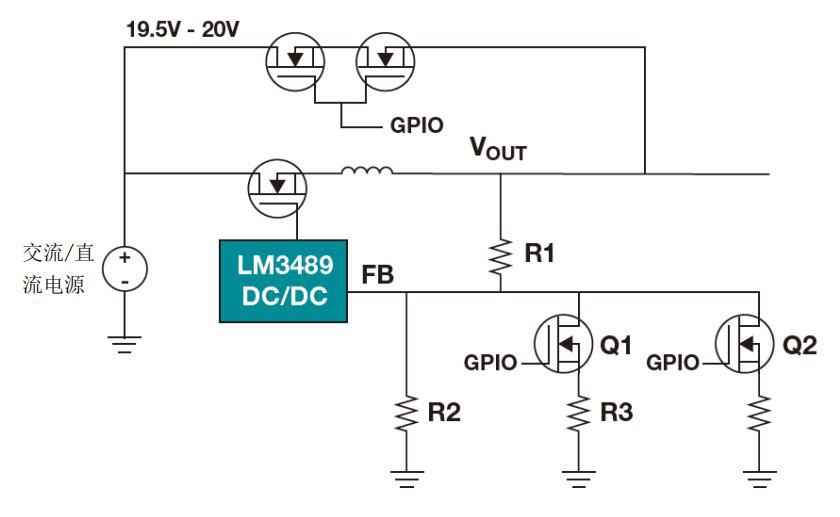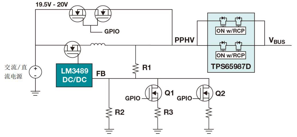 對于這個具體的設計示例,我會使用 TI 的 LM3489 磁滯 p 溝道 FET(PFET)控制器。該集成電路(IC)允許外部 PFET 上 100%的占空比,可直接從 AC/DC 轉換器通過外部 19.5 V。市場上大多數 USB PD 控制器都具有通用輸入/輸出(GPIO),用于控制外部穩壓器輸出電壓。PD 控制器可以通過調節降壓的反饋網絡來調整 LM3489 DC/DC 降壓轉換器的輸出電壓。